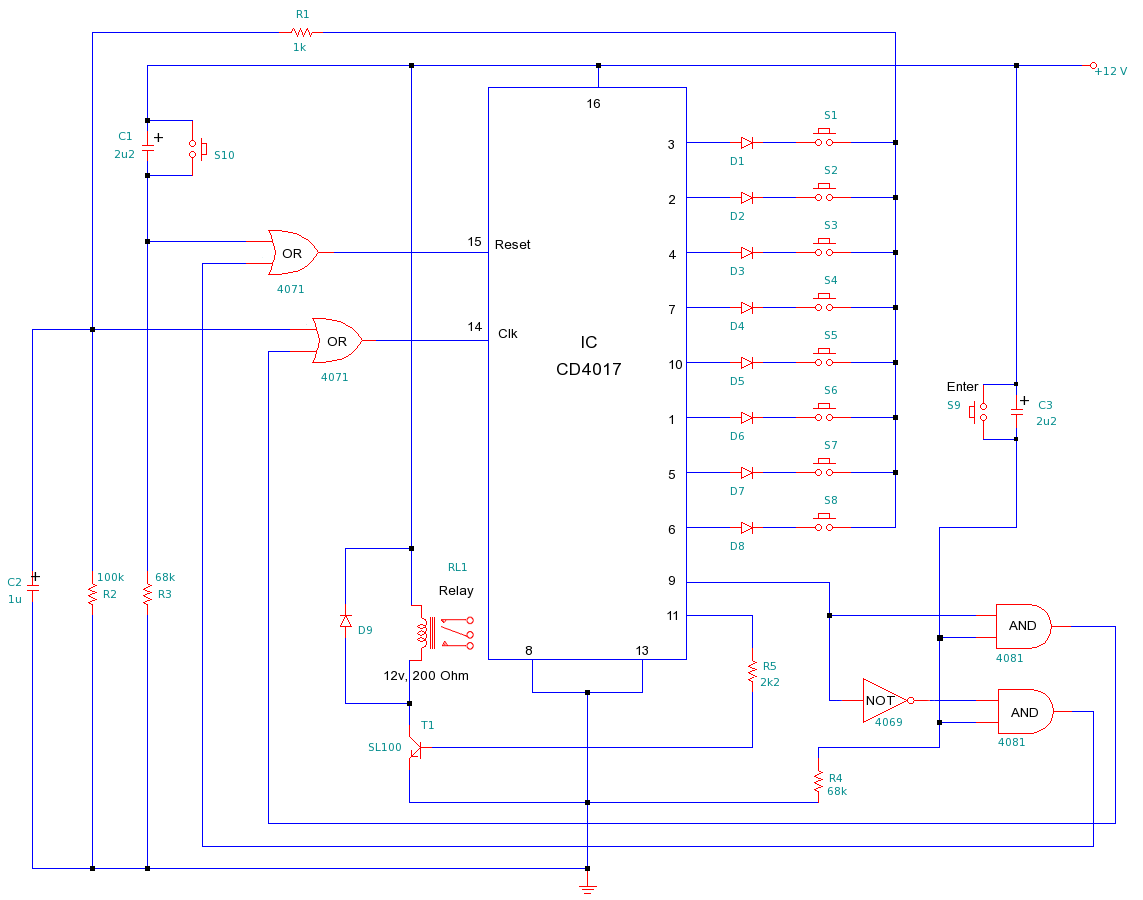 This is a simple but efficient Electronic lock. This lock can be used to protect any electronic systems from unauthorized usage. To get access the uses needs to know 8 digit pass-code or password. When the user enters correct 8 digit password followed by "Enter" button, it activates the relay allowing access to the system controlled by relay. If the 8 digit pass-code is incorrect, after pressing "Enter" button, the circuits reset's itself without turning the relay on.
