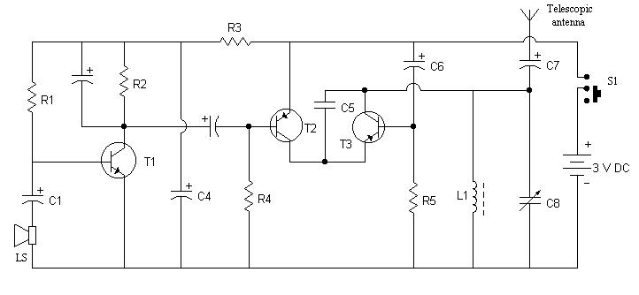 In this circuit loud-speaker(LS) is used as a microphone to convert sound wave into audio signal. Transistor BC148 works as an audio amplifier, and Transistor 2N481 works as radio frequency oscillator. The transistor 2N363 modulates the audio signal to the carrier radio frequency, produced by the oscillator. The modulated signal is then transmitted to air by telescopic antenna.
